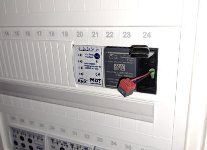 Die KNX Klemmenbuchse ist für den Einbau in der Verteilung gedacht. Sie ist 1 Teileinheit Breit.